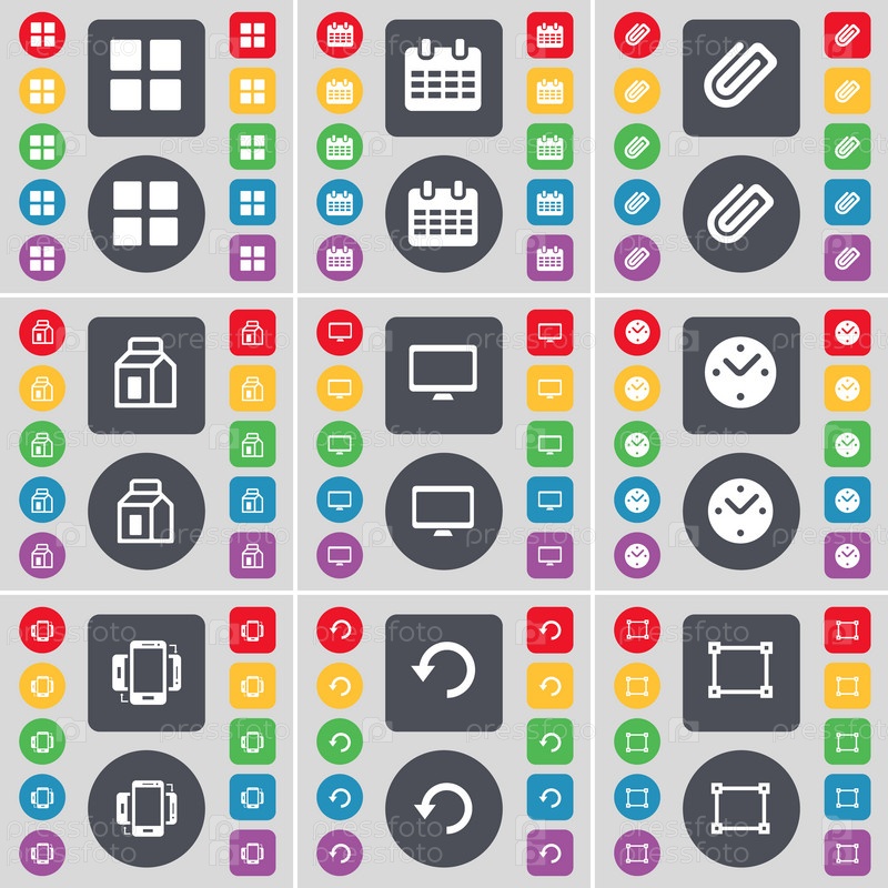 Приложений, календарь, клип, упаковка, монитор, часы, смартфон, перезагрузка, рама значок символа. Большой набор плоских, цветные кнопки для вашего дизайна. Вектор
