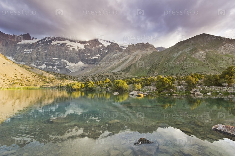 Голубая гора озеро, окруженное высокими пиками на закате