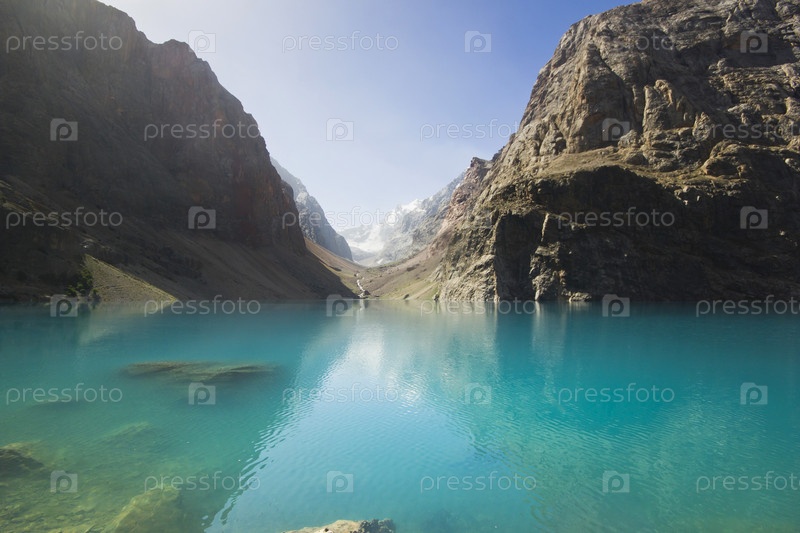 Голубое озеро отражает высокие скалы