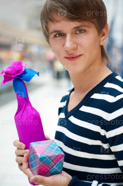 Юноша с подарочной коробочкой и бутылкой вина в розовой упаковке