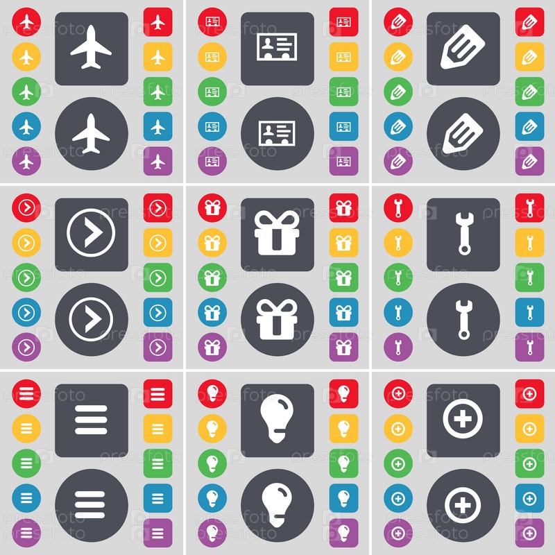 Самолет, контактный элемент, карандаш, стрелка справа, подарок, гейковерт, приложения, лампочки, плюс значок символа. большой набор плоских цветных кнопок для вашего дизайна. вектор