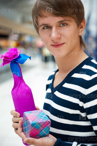 Юноша с подарочной коробочкой и бутылкой вина в розовой упаковке ждет подругу