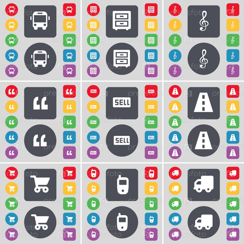 Автобус, тумбочка, скрипичный ключ, вопросительный знак, продать, дорога, торговый корзину, мобильный телефон, грузовик значок символа. Большой набор плоских, цветные кнопки для вашего дизайна. Вектор