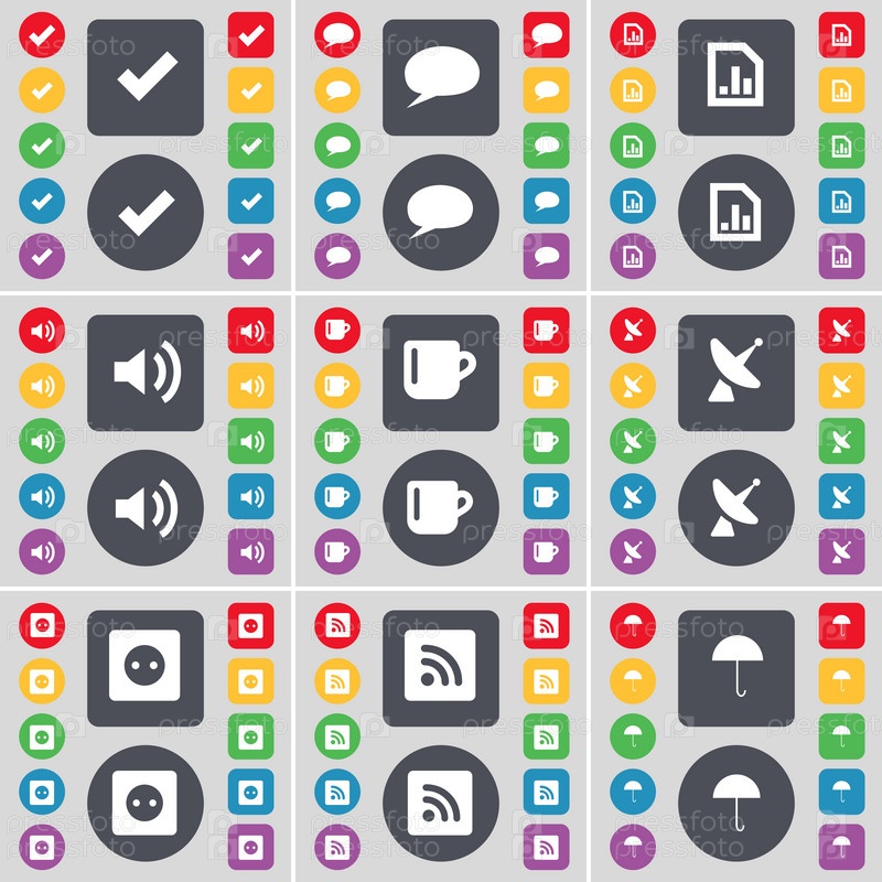 Тик, чат-пузырь, файловые схемы, звук, кубок, спутниковая тарелка, разъем, RSS, символ значка зонтика. Большой набор плоских цветных кнопок для вашего дизайна. вектор