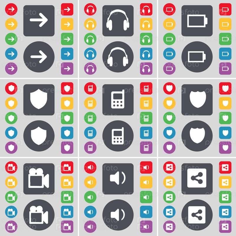 Стрелка справа, наушники, батарея, знак, мобильный телефон, пленочной камеры, звук, доля значок символа. Большой набор плоских, цветные кнопки для вашего дизайна. Вектор