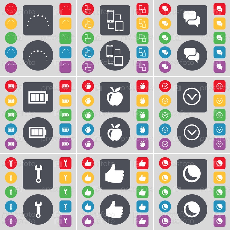 Звезда, связь, чат, батарея, приложения, стрелка вниз, гейковерт, как лунный значок символа. большой набор плоских цветных кнопок для вашего дизайна. вектор