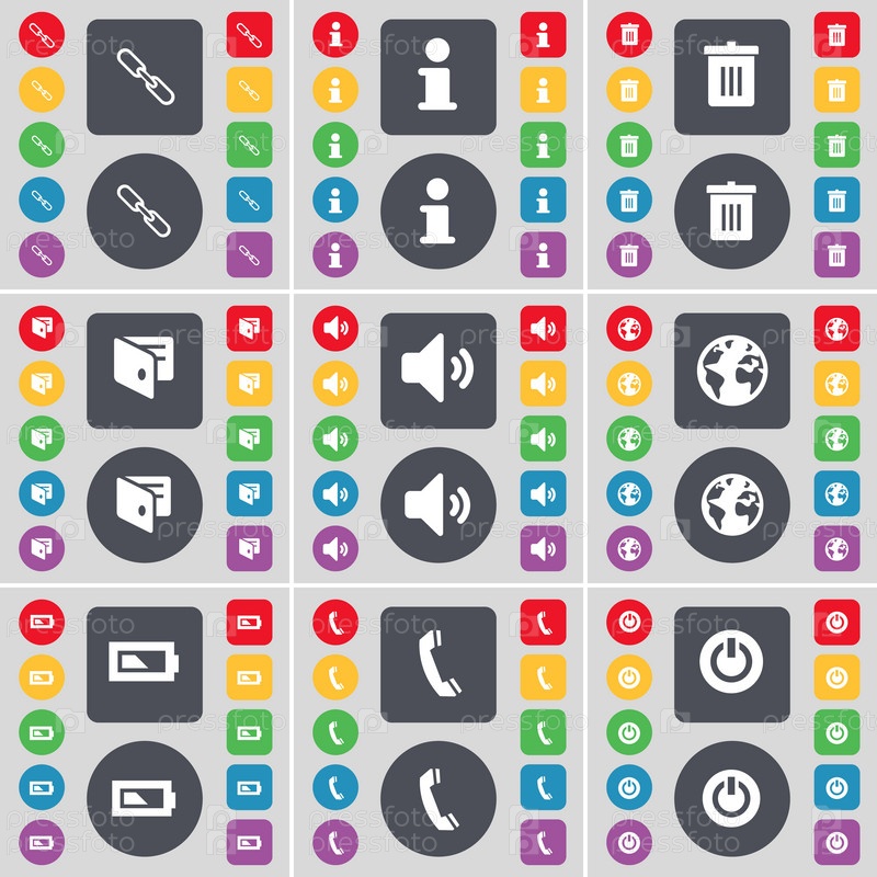 Связь, информация, мусорные урны, бумажник, звук, земля, батарея, приемник, мощность значок символа. Большой набор плоских, цветные кнопки для вашего дизайна. Вектор