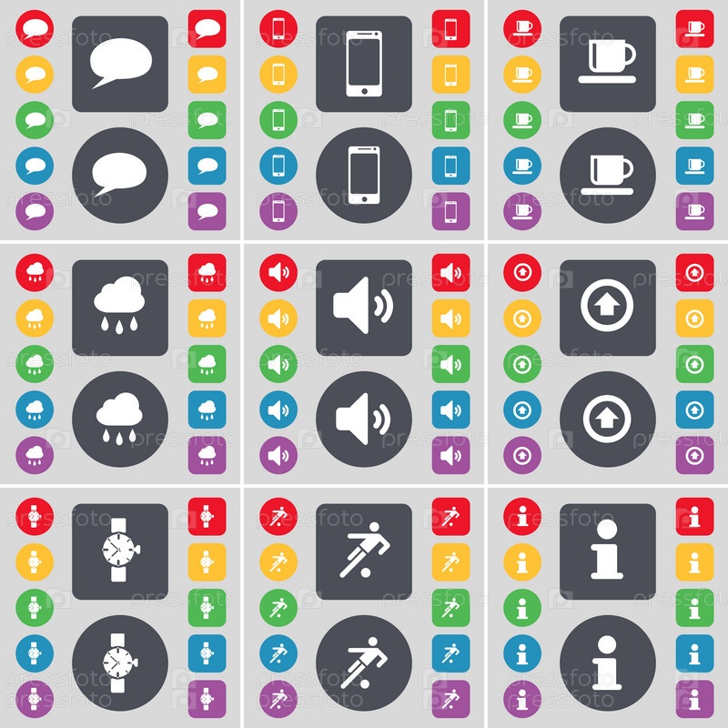 Чат пузырь, смартфон, Кубок, облако, звук, стрелка вверх, наручные часы, силуэт, информация значок символа. Большой набор плоских, цветные кнопки для вашего дизайна. Вектор