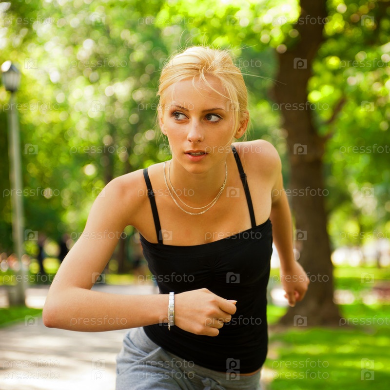 Молодая блондинка бегает в парке