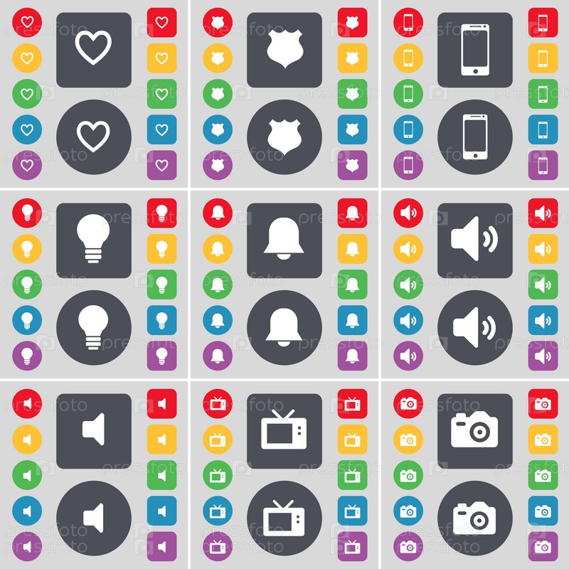 Сердце, полиции значок, смартфон, лампочки, уведомления, звук, Ретро ТВ, символ значок камеры. Большой набор плоских, цветные кнопки для вашего дизайна. Вектор