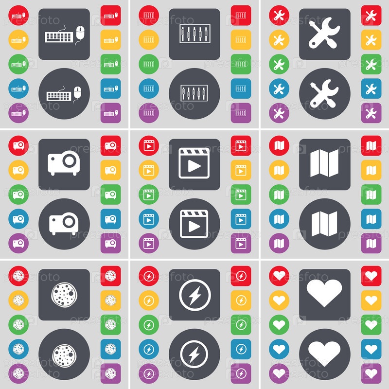 Клавиатура, эквалайзер, гейковерт, проектор, медиа-плеер, карта, пицца, Флэш, символ иконки сердца.Большой набор плоских цветных кнопок для вашего дизайна.Вектор