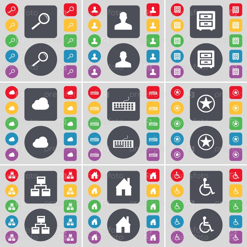Увеличительное стекло, аватар, кровать таблицы, облако, клавиатура, звезда, сеть, дом, инвалидов лица значок символа. Большой набор плоских, цветные кнопки для вашего дизайна. Вектор