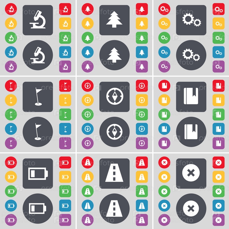 Микроскоп, елочка, снаряжение, гольф отверстие, компас, словарь, батарея, дороги, остановки значок символа. Большой набор плоских, цветные кнопки для вашего дизайна. Вектор