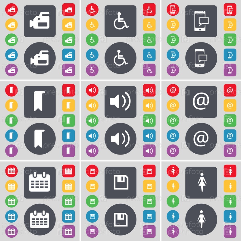 Пленочная камера, инвалиды, SMS-сообщения, маркеры, звук, почта, календарь, флоппи, силуэт значок символа. Большой набор плоских цветных кнопок для вашего дизайна. вектор