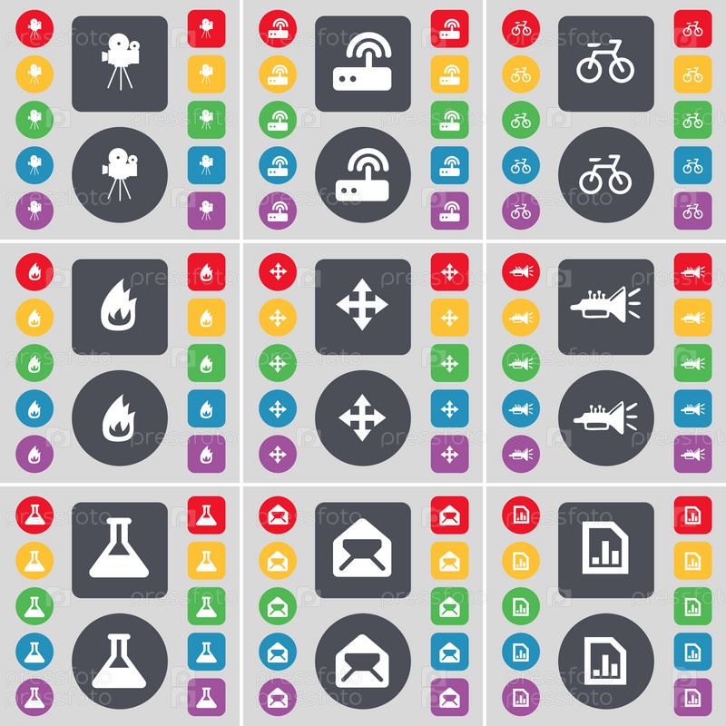 Кинокамера, маршрутизатор, велосипеды, огонь, перемещение, Trumped, флаг, сообщение, схема файла значок символа. большой набор плоских цветных кнопок для вашего дизайна. вектор