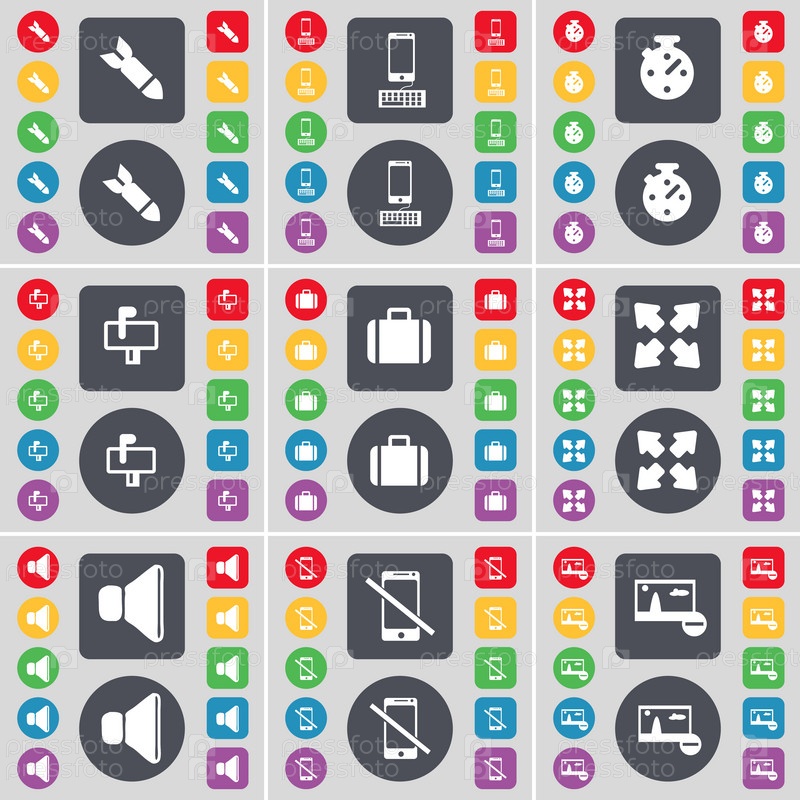 Ракета, смартфон, секундомер, почтовый ящик, чемодан, полный экран, звук, смартфон, картинка значок символа. Большой набор плоских, цветные кнопки для вашего дизайна. Вектор