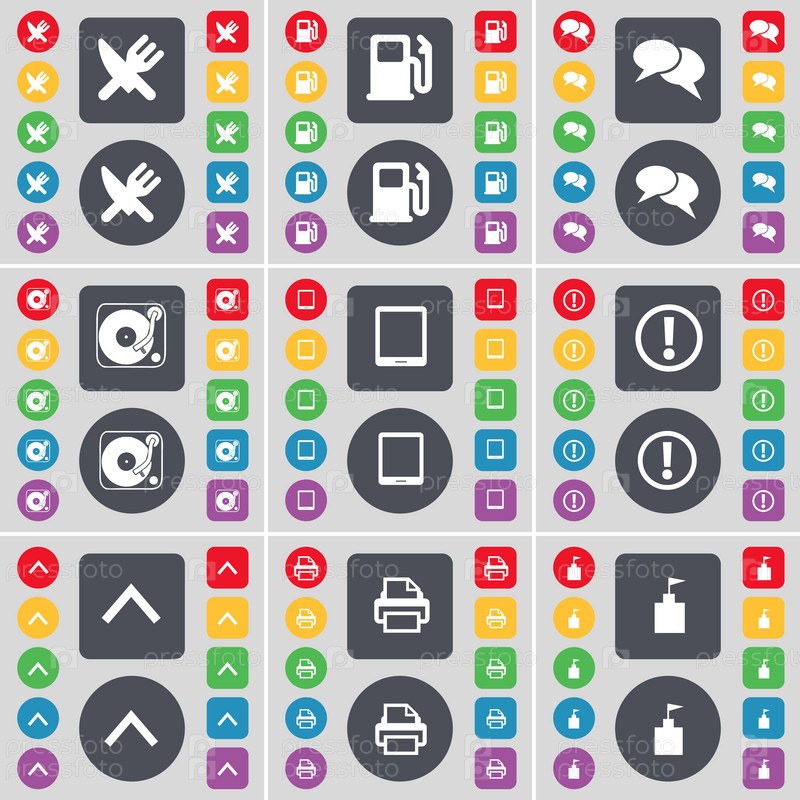 Вилка и нож, заправка, чат, граммофон, планшетный ПК, предупреждение, стрелка вверх, принтер, флаг башни значок символа. большой набор плоских цветных кнопок для вашего дизайна. вектор