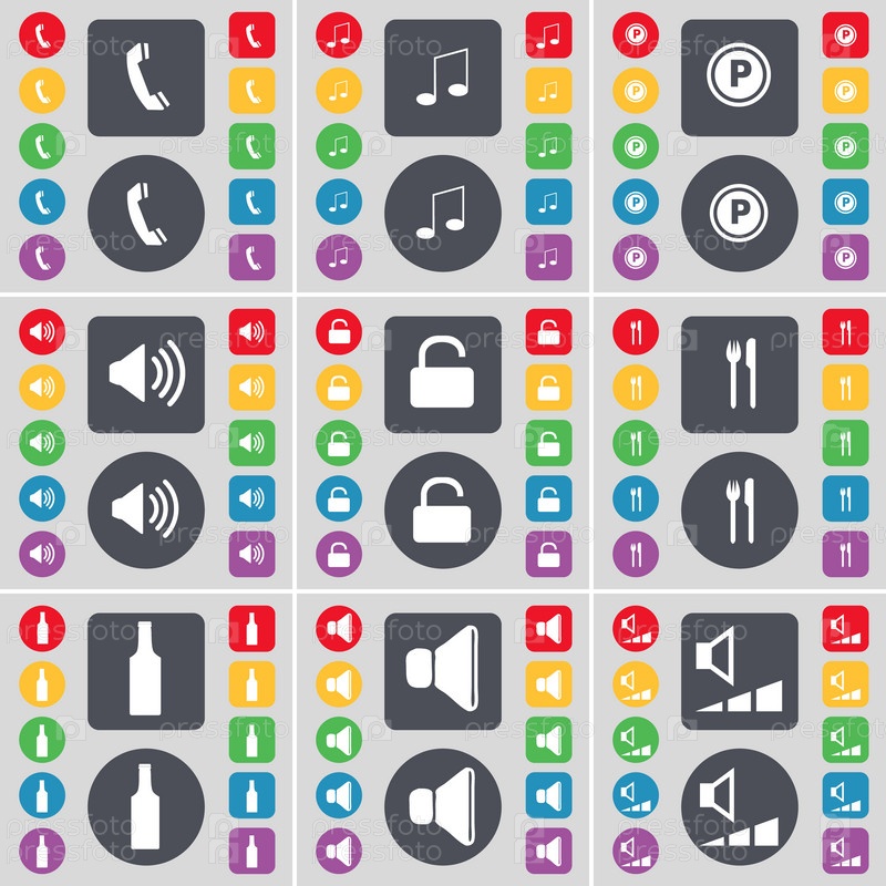 Приемник, Примечание, парковка, звук, замок, вилка и нож, бутылка, звук, громкость значок символ. Большой набор плоских, цветные кнопки для вашего дизайна. Вектор