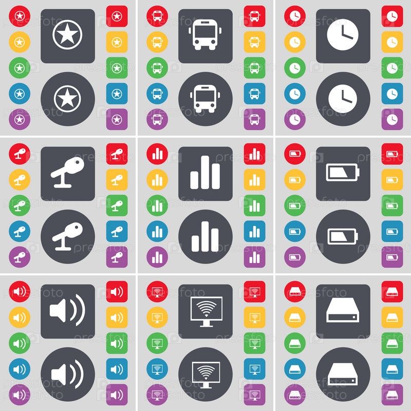 Звезда, автобус, часы, микрофон, диаграмма, батарея, звук, монитор, символ значок жесткого диска. Большой набор плоских, цветные кнопки для вашего дизайна. Вектор