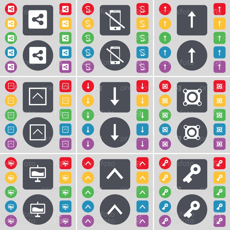 Доля, смартфон, стрелка вверх, стрелка вниз, спикер, граф, значок символ ключа. Большой набор плоских, цветные кнопки для вашего дизайна. Вектор