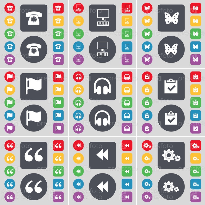 Ретро-телефон, ПК, Бабочка, флаг, наушники, обзор, запятые, Rewind, значок шестерени. большой набор плоских цветных кнопок для вашего дизайна. вектор
