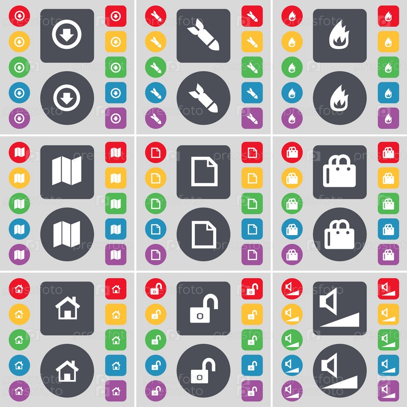 Стрелка вниз, ракета, огонь, карта, файлов, корзина, дом, замок, тома значок символа. Большой набор плоских, цветные кнопки для вашего дизайна. Вектор