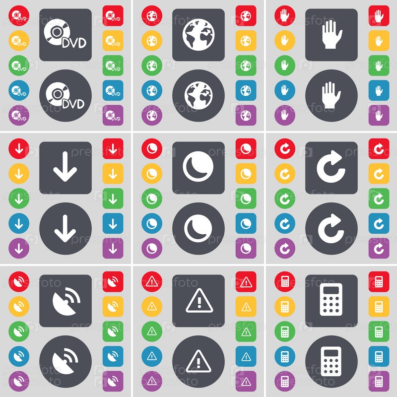 DVD, планета, рука, стрелка вниз, Луна, перезагрузка, спутниковая антенна, предупреждение, иконка символа калькулятора Большой набор плоских цветных кнопок для вашего дизайна. вектор