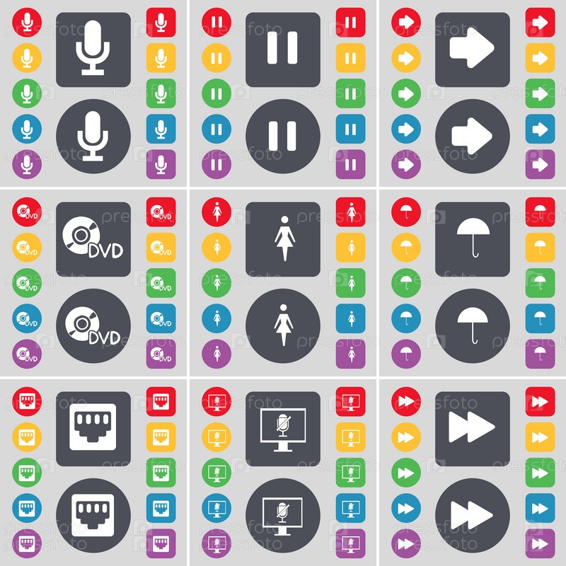 Микрофон, пауза, стрелка направо, DVD, силуэт, зонтик, LAN-сокет, монитор, переверните значок символа. Большой набор плоских цветных кнопок для вашего дизайна