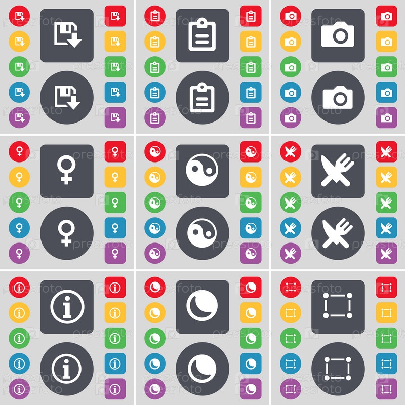 Флоппи, обследования, камеры, символ Венеры, Инь-Ян, вилка и нож, информация, Луна, символ значок кадра. Большой набор плоских, цветные кнопки для вашего дизайна. Вектор
