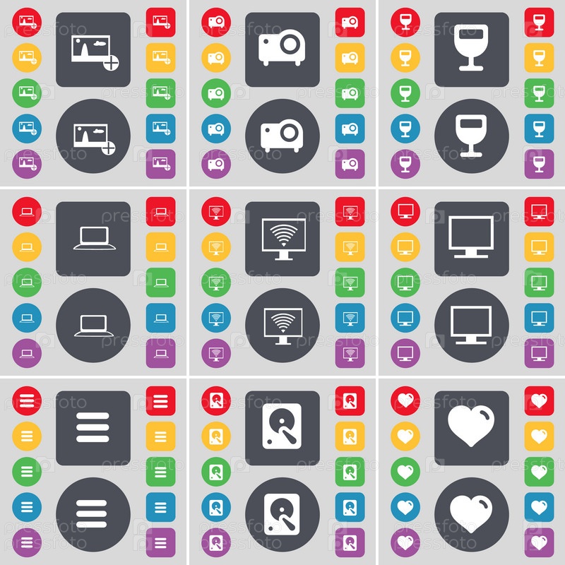 Фотография, проектор, Wineglass, ноутбук, монитор, приложения, жесткий диск, символ иконки сердца. большой набор плоских цветных кнопок для вашего дизайна. вектор