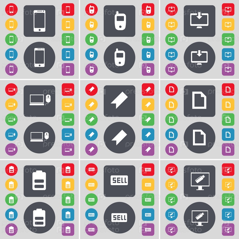 Смартфон, мобильный телефон, монитор, ноутбук, маркер, файл, батареи, продажа значок символа. Большой набор плоских, цветные кнопки для вашего дизайна. Вектор