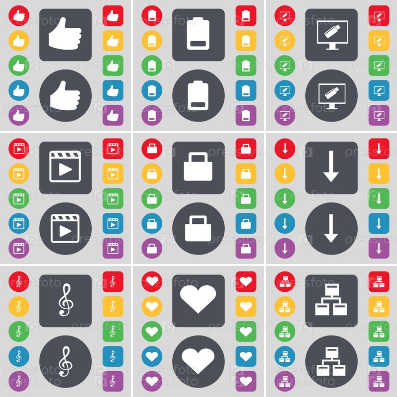 Как, батарея, монитор, медиа-проигрыватель, чемодан, стрелка вниз, скрипичный ключ, сердце, символ значок сети. Большой набор плоских, цветные кнопки для вашего дизайна. Вектор