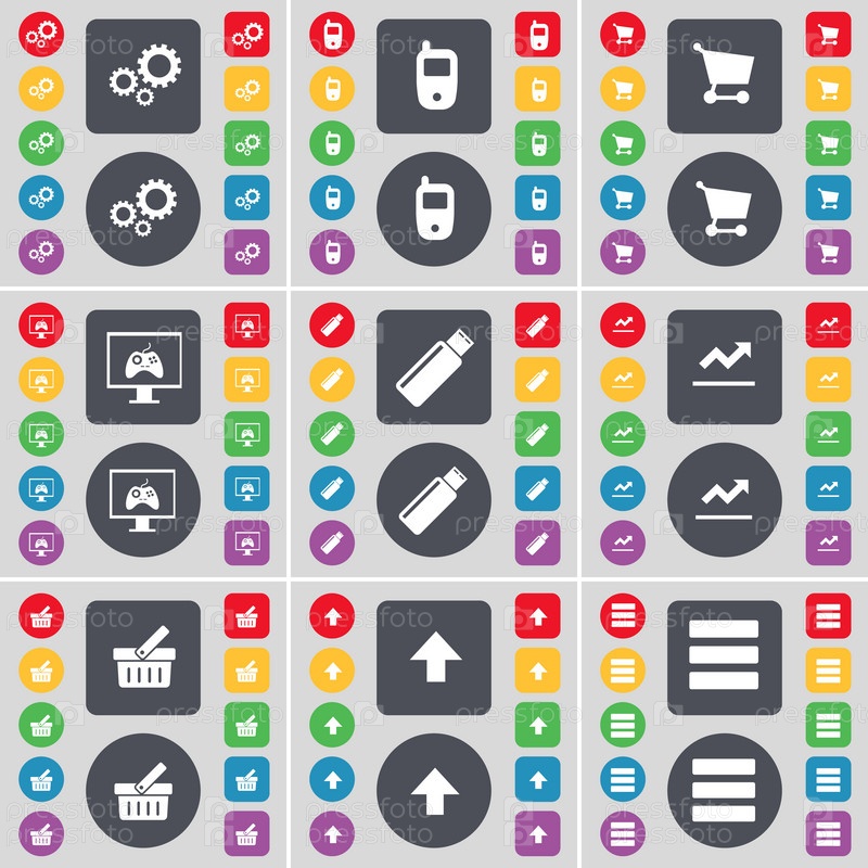 Шестерни, мобильный телефон, корзина, монитор, USB-накопитель, графика, корзина, стрелка вверх, символ значка приложения. Большой набор плоских цветных кнопок для вашего дизайна. вектор