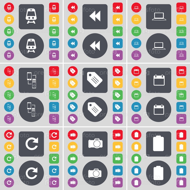 Поезд, Rewind, ноутбук, Обмен информацией, тег, календарь, перезагрузка, камера, значок символа батареи. большой набор плоских цветных кнопок для вашего дизайна. вектор