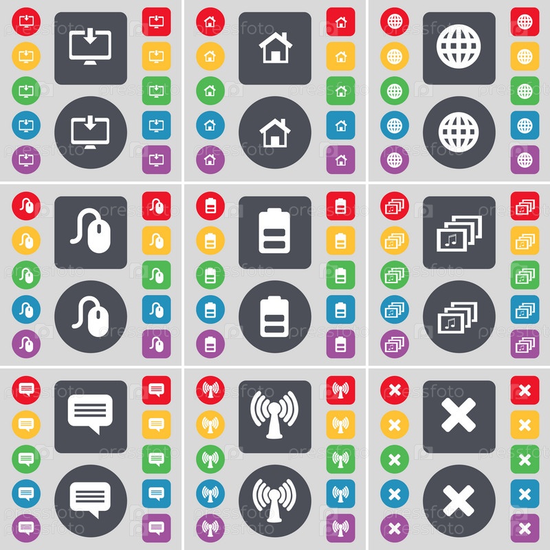 Монитор, дом, глобус, мышь, батарея, галерея, пузырь для чата, Wi-Fi, значок символа остановки. Большой набор плоских цветных кнопок для вашего дизайна