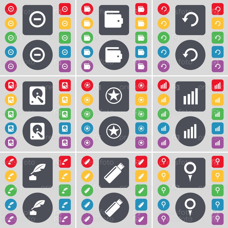 Минус, кошелек, перезагрузка, жесткий диск, звезда, диаграмма, чернила, USB, символ значка контрольной точки. Большой набор плоских цветных кнопок для вашего дизайна. вектор
