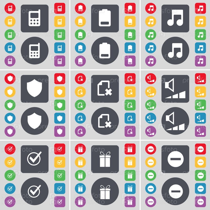Мобильный телефон, аккумулятор, Примечание, знак, файл, объем, тик, подарок, минус значок символа. Большой набор плоских, цветные кнопки для вашего дизайна. Вектор