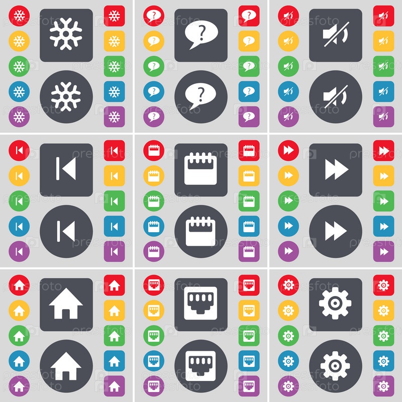 Снежинка, пузырь для чата, Мутный звук, пропускать медиа, камеры, перевернуть назад, дом, разъем LAN, значок коробки передач. большой набор плоских цветных кнопок для вашего дизайна. вектор