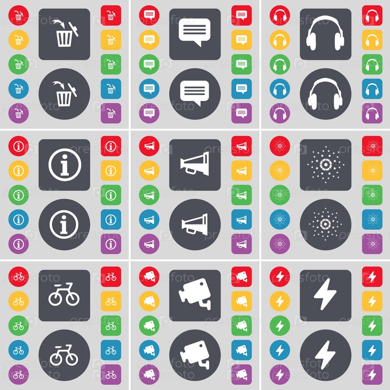 Мусор может быть пузырем чата, наушниками, информацией, Мегафоном, звездой, велосипедом, CCTV, символом значка Flash. Большой набор плоских цветных кнопок для вашего дизайна. вектор