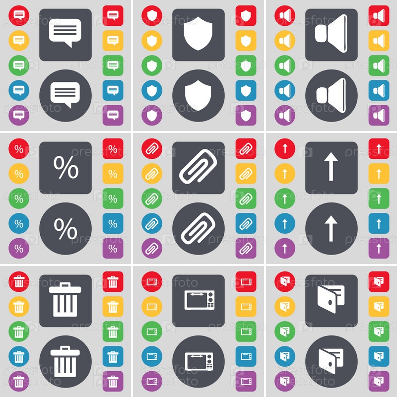 Чат пузырь, знак, звук, процент, клип, стрелка вверх, мусорный бак, Микроволновая печь, бумажник значок символа. Большой набор плоских, цветные кнопки для вашего дизайна. Вектор
