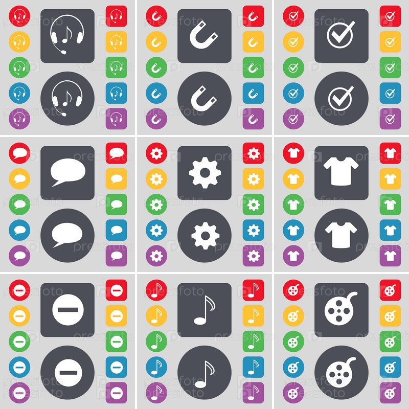 Наушники, магнит, тик, пузырь для чата, Гир, футболка, минус, примечание, видеозапись значок символа. большой набор плоских цветных кнопок для вашего дизайна. вектор