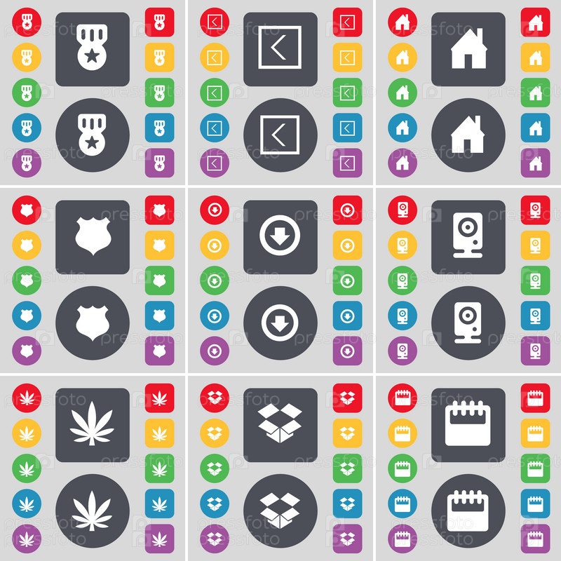 Медаль, стрелка слева, дом, полицейский значок, стрелка, спикер, марихуана, Dropbox, символ икон календаря. большой набор плоских цветных кнопок для вашего дизайна. вектор