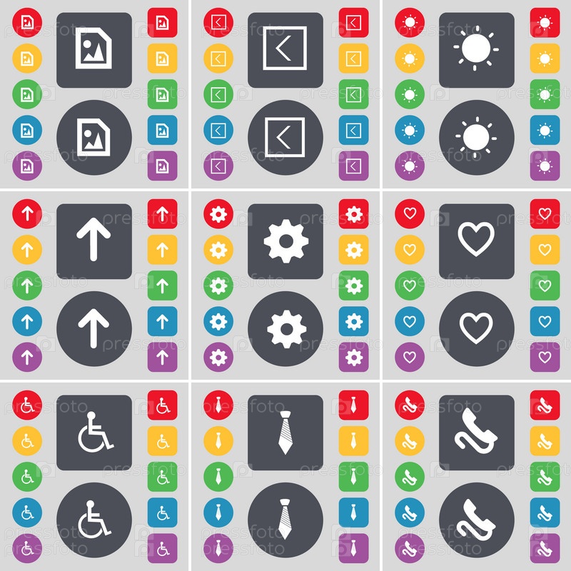 Мультимедийный файл, стрелка влево, свет, стрелка вверх, Гир, сердце, инвалидное лицо, галстук, приемник значка символа. Большой набор плоских цветных кнопок для вашего дизайна. вектор
