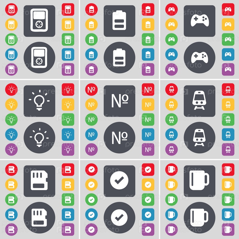 Игрок, батарея, геймпад, лампочки, номер, поезд, сим-карты, тик, кубок значка символа. большой набор плоских цветных кнопок для вашего дизайна. вектор