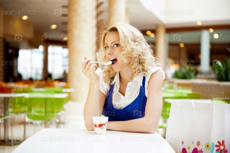 Молодая женщина наслаждается десертом в кафе