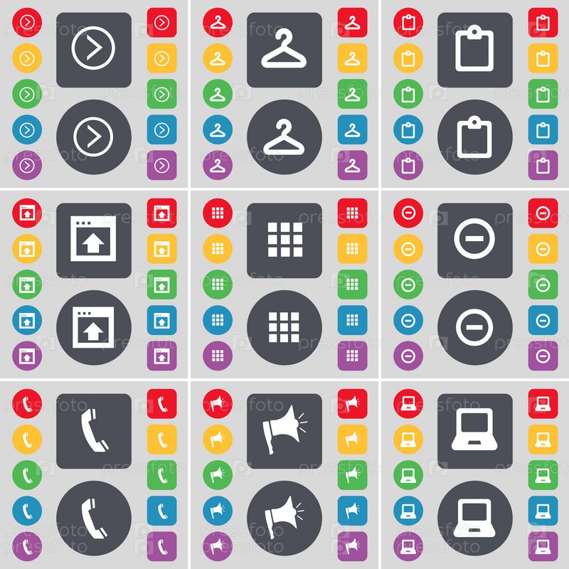 Стрелка справа, вешалка, обследования, окна, приложения, минус, приемник, Мегафон, ноутбук значок символа. Большой набор плоских, цветные кнопки для вашего дизайна. Вектор