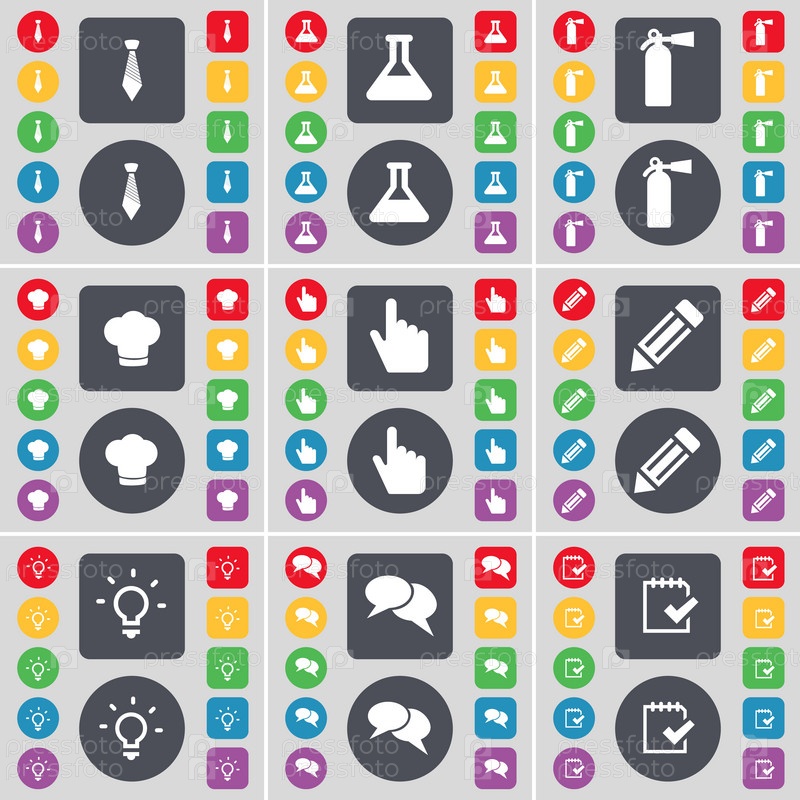 Галстук, фляга, Огнетушитель, приготовление шляпу, рука, карандаш, свет, чат пузырь, обследования значок символа. Большой набор плоских, цветные кнопки для вашего дизайна. Вектор
