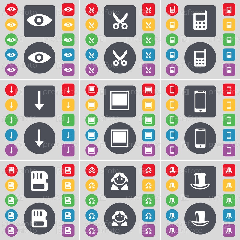 Видение, ножницы, мобильный телефон, стрелка вниз, окна, смартфон, сим-карты, аватары, символы значка шелковой шляпы. Большой набор плоских цветных кнопок для вашего дизайна. вектор