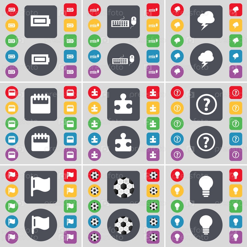 Аккумулятор, клавиатуры, молния, календарь, головоломка, вопросительный знак, флаг, мяч, значок символ света лампы. Большой набор плоских, цветные кнопки для вашего дизайна. Вектор