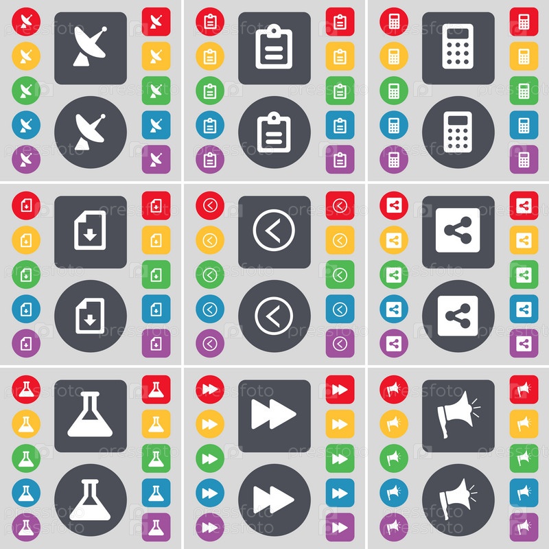 Спутниковая тарелка, исследования, калькулятор, скачать файл, стрелка влево, доля, флаг, Rewind, иконка символа Мегафон. Большой набор плоских цветных кнопок для вашего дизайна. вектор